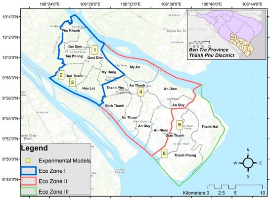 The district can be divided into three ecological sub-regions based on salinity levels: I, II, and III as shown in Figure 1. EcoZone I (freshwater area): This area is about 11,565 hectares ranging from Binh Thanh commune to Thanh Phu town. The region is a freshwater area where two (or even three in specific areas) crops of rice are harvested within one year and are also surrounded by an anti-salinity dike line that belongs to the Project 418 of the Government. Paddy fields in this region are irrigated with fresh water. EcoZone II (brackish water area): This region has an area of about 10,000 hectares ranging from Binh Thanh commune seaward to An Dien commune. This area achieved one rice harvest per year with black tiger shrimp and white-legged shrimp cultivated intermittently. EcoZone III (saline water area): This region has an area of about 21,000 ha and specializes in extensive aquaculture of shrimp, crab, and clam hosted in mangrove forests.