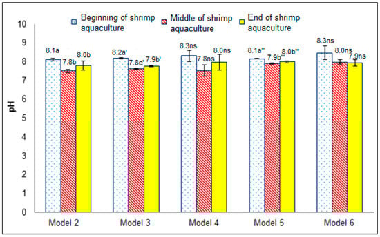 The results presented in Figure 3 show that the salinity of water in the farming models varies from 2.76 to 17 mS·cm−1. Two models in the freshwater area had salinity ranging from 2.76 to 5.12 mS·cm−1. The rotation model of black tiger shrimp-rice intercropping and blue prawn (model 4—brackish area) had salinity ranging from 7.98 to 12.77 mS·cm−1. Model of tiger shrimp-white shrimp rotation and the model of extensive shrimp (saline area) had salinity ranging from 10.3–17 mS·cm−1. In general, the salinity thresholds of fresh, brackish, and saline area models are suitable for the development of blue prawn and black tiger shrimp. The salinity that is appropriate for the development of the black tiger shrimp ranges from 0 to 10 mS·cm−1 []. On the contrary, other studies suggested that the pH range for optimal growth of black tiger shrimp is 10–30 mS·cm−1 [,,] or 15–35 mS·cm−1 [].