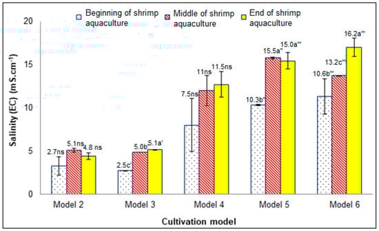 Variations of water salinity in farming models. Notes: a and b are compared according to sampling time, the same letters within the same column or row have no significant difference. The symbols ’, ’’, ’’’ are used to distinguish different experimental or model areas. ns: no difference (compared at a significance level of 5%).