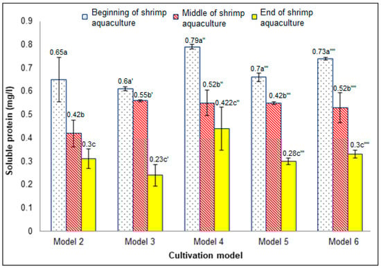 The soluble protein content is another critical indicator representing nutrition in a farming pond. The excessive-high concentration of soluble protein may cause phytoplankton blooming, resulting in possible eutrophication. As suggested by Chanratchakool (2003), water with NH4+ nitrogen of higher than 4 mg/L is considered undesirable for shrimping farming []. The results presented in Figure 4 show that the content of soluble protein varied greatly from 0.30 to 0.79 mg/L. The models in the freshwater sub-region exhibited soluble protein content ranging from 0.24 to 0.65 mg/L. The content of models in brackish and saline areas ranged from 0.3 to 0.74 mg/L. This result is consistent with the threshold value of soluble protein for blue prawn, tiger shrimp, and white-legged shrimp. To be specific, Duong Nhat Long (2012) suggested the appropriate threshold for optimal development of blue prawn is NH4+ <1 mg/L []. Similarly, other studies suggested that the content of soluble nitrogen suitable for shrimp ponds could range from 0.2 to 2.0 mg/L [,].
