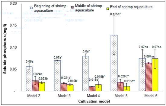 Overall, soluble phosphorus content is declining over time, and the differences are significant. This result is consistent with the study of Thai Truong Giang that the phosphorus content in pond water is low and is provided mainly through chemical fertilizers to stimulate phytoplankton to develop as a natural food source for shrimp []. In addition, dissolved phosphorus is also lost by uptake by phytoplankton and aquatic organisms and the phosphate uptake of the sediment sludge. As a result, it is necessary to supplement an additional amount of phosphorus to ensure the growth of shrimps in ponds [].