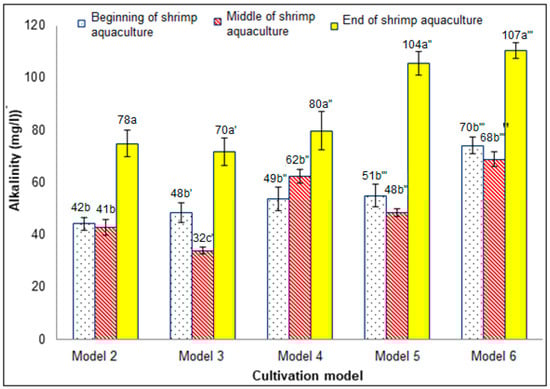 Similar to the results of soluble phosphorus content, alkalinity tended to increase over time. Alkalinity of all farming systems in the fresh, brackish, and saline areas was low at the beginning, the middle of the crop and was elevated at the end of the season. This may be due to the increase in alkalinity during the application of lime. In addition, the alkalinity of aquaculture ponds depends on the properties of pond substrate and water. For ponds in sandy soils, total alkalinity could be around 20 mg/L and ponds in limestone soils often have alkalinity above 100 mg/L []. Other possibilities could be due to low salinity, leading to low carbonate and bicarbonate, and underdeveloped phytoplankton, which hinders the primary production of the pond and lowers alkalinity. On the contrary, high alkalinity reduces pH fluctuations by HCO3− and CO32− buffer and contributes to the assessment of acid neutralization capacity of water, expressed by HCO3−, CO32−, OH− ions []. In general, in comparison with the optimal range for shrimp development, the alkalinity in the models is low at the beginning []. Therefore, to increase the alkalinity in the water, it is necessary to apply to add lime to the early stages of stocking and after rainfalls to maintain pond quality and pH stability [].