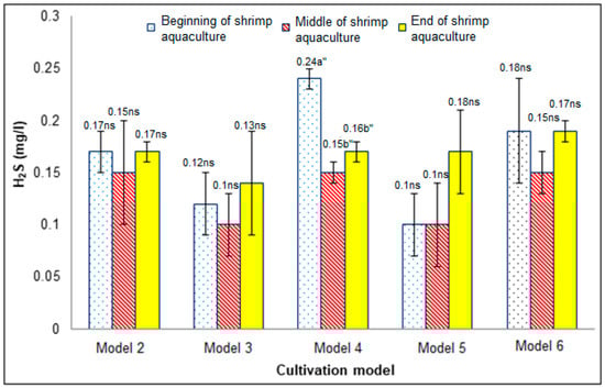 The presence of H2S, even in a small amount, is harmful to the development of aquatic organisms [,,]. Previous studies suggested that H2S concentration in shrimp pond water should not exceed 0.03 mg/L as H2S concentrations in the higher than 0.01 mg/L is undesirable [] and H2S content in the range of 0.037–0.093 mg/L has been proved to be fatal on shrimps []. In general, through the analysis results, concentrations of H2S were above the appropriate threshold for the development of shrimps in all farming models, posing a high risk for most ponds in the study area. Therefore, it is necessary to prepare and rehabilitate the pond before seeding shrimps, and at the same time increase the ventilation in the pond through the implementation of the fan systems in the black tiger shrimp monoculture system.