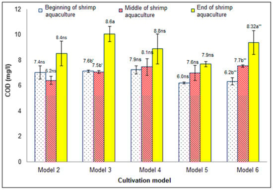 Fluctuations in chemical oxygen demand (COD) content in farming models. Notes: a and b are compared according to sampling time, the same letters within the same column or row have no significant difference. The symbols ‘, ‘’’ are used to distinguish different experimental or model areas. ns: no difference (compared at a significance level of 5%).