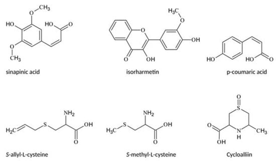 - Hornickova, J.; Kubec, R.; Cejpek, K.; Velíšek, J.; Ovesná, J.; Stavělíková, H. Profiles of S-alk(en)ylcysteine sulfoxides in various garlic genotypes. Czech J. Food Sci. 2010, 28, 298–308. [Google Scholar] [CrossRef]