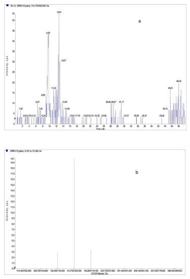 (a) Example of a XIC chromatogram obtained for a sample of Ornak collected in May. The chromatogram was obtained for the pair of ions m/z = 314/300, identified as isorhamnetin; (b) Fragmentation mass spectrum (MS/MS for m/z = 314 − isorhamnetin).