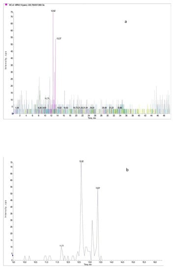(a) The XIC chromatogram for all ionic pairs of Ornak collected in June; (b). Example of a XIC chromatogram obtained for sample of Ornak collected in June. The chromatogram was obtained for the ionic pair m/z = 222.7/207.8 which was identified as sinapinic acid.