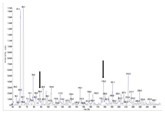 Mass spectrum of a pick obtained for a sample of Harnaś collected in June. The pick was obtained for S-allyl-L-cysteine sulfoxide (m/z = 178/88). The ion pairs, which was identified as S-allyl-L-cysteine sulfoxid, is marked with arrows.