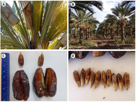 Experimental area and seed extraction. (A) Female inflorescences covered with paper bags after pollination to avoid contamination with other pollen sources. (B) Panoramic view of the plantation 50 days after pollination. (C) Removing the seed of the ripe fruit. (D) Sample of seeds extracted from the pollinated fruit with the ‘Zahidi’ pollen source.