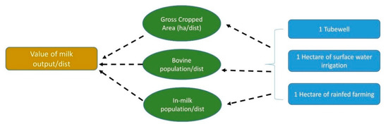 Total bovine population, in-milk bovine population, herd efficiency, value of milk, output in rainfed area, groundwater irrigated area, and surface water irrigated area.