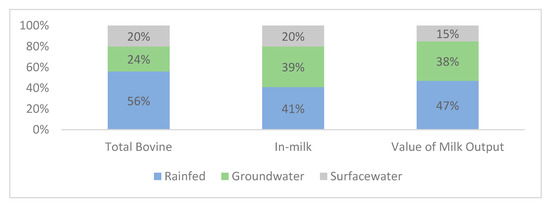 Share of rainfed, groundwater irrigated, and surface water irrigated areas in the total bovine population, in-milk bovine population, and value of milk output, respectively.