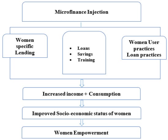 From the 1970s, microfinance has been seen as a useful element in poverty reduction and policy development []. Microfinance is deemed to have a positive impact on the recipient’s livelihood, and that, in turn, could better their life quality and help them come out of poverty []. Recipients of microfinance loans seem to enjoy better socioeconomic status as reflected in their better living condition; including better health and nutrition than non-recipients of the program [] and reduction in severe malnutrition is positively influenced by being a member of microfinance program for a more extended period, and it eases consumption as well. Microfinance helps recipients in better understanding the importance of health and nutrition, and that, in turn, enhances family’s food security and kids’ nutrition []. Empowerment is generally considered as in the context of development and not just microfinance [] and more so in case of women’s empowerment.