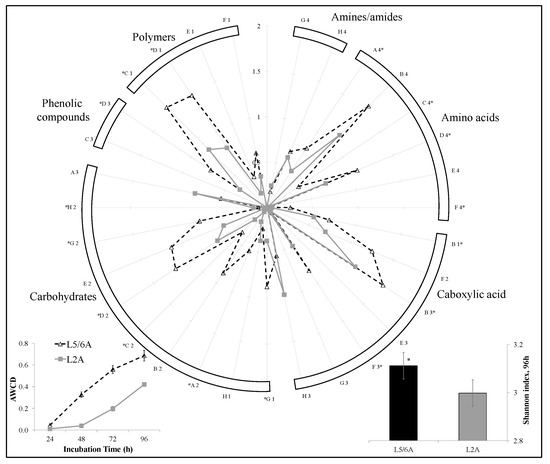 On the centre, BIOLOG EcoPlate™ substrate degradation by microbial communities of the two composts (L2A vs. L5/6A), grouped for class of substances (see Table 3 for details). Below, average well-colour development (AWCD) and Shannon index (H’), on the left and on the right respectively, of metabolized substrates in BIOLOG EcoPlate™ by the microbial communities of the two composts. One-way ANOVA (compost type) (1 d. f.) of analysed properties. * p < 0.01.