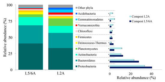 16S rRNA gene amplicon sequences for the 10 most abundant phyla, covering 95% of taxonomic annotations, outlined high abundances of Proteobacteria, Bacteroidetes, Actinobacteria, and Deinococcus-Thermus, all of them more abundant in the L5/6A compost. On the other hand, Verrumicrobia, Gemmatimonadetes, Acidobacteria, and Planctomycetes phyla was more abundant in the L2A compost (Figure 4).