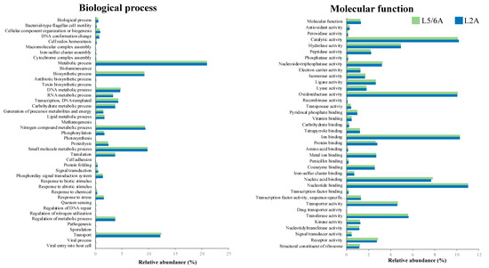 The EBI analysis pipeline offers functional analysis for predicted protein coding sequences in metagenomic data sets using InterProScan [31] and Gene Ontology [32] terms. In our study, functional annotation has been performed using the WGS raw reads, because the low number of reads sequenced did not allow for comprehensive functional annotation using MAGs; all the results were reported as relative abundance percentage (Figure 7). Both composts showed almost the same level of annotation for all the Gene Ontology categories. In particular, the metabolic process, biosynthetic process, nitrogen compound metabolic process, and transport were the most abundant categories for biological process category. Meanwhile, catalytic activity, oxidoreductase activity, ion binding, and nucleic binding were the most abundant for molecular function category.