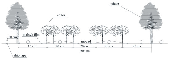 The tested crops were cotton No. 49 Xinluzhong and 5-year-old jujube trees (2015). Cotton was sowed in mid-April and harvested in early November. Jujube trees entered the germination stage in late April and were harvested in mid-November. Jujube tree spacing was 1 m, and row spacing was 4 m. The drip irrigation belt was placed 30 cm away from each side against the tree trunk. Cotton was planted with four rows of one film and one belt. The distance between drippers of the drip irrigation belt was 20 cm, and the dripper flow rate was 1.38l/h. The film was 1.5 m wide and 0.05 mm thick. Plant spacing was 8 cm. The row spacing was 20-40-20 cm. The planting pattern is shown in Figure 1. Five treatments were performed in the experiment, one for jujube, one for cotton, and three for jujube/cotton intercropping according to the irrigation amount of jujube and cotton. The irrigation schedule for each treatment is shown in Table 1, and three replicates were set up for each treatment. The experimental designs for 2015, 2016, and 2017 are the same. However, the experimental field was irrigated at fixed irrigation time points by the fixed irrigation quota method from 2015 to 2016. In 2017, the P–M method [11] was used to guide irrigation in the experimental field and the irrigation period was 7 days. The irrigation amount was determined by the cumulative evapotranspiration of the previous irrigation cycle. The jujube crop coefficient was calculated as reported by Hong et al. [23]. The cotton crop coefficient was calculated as reported by Zhang et al. [24] and Ma et al. [25]. The fertilization and crop management were determined based on the local conditions.