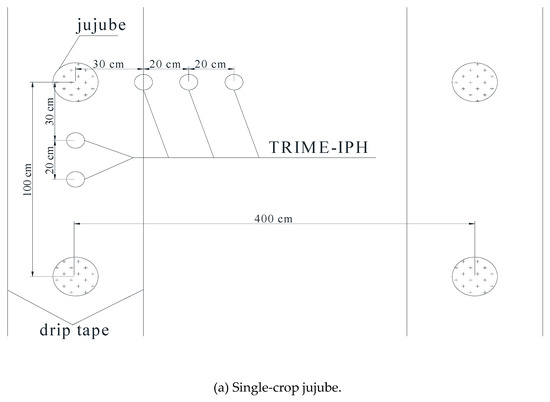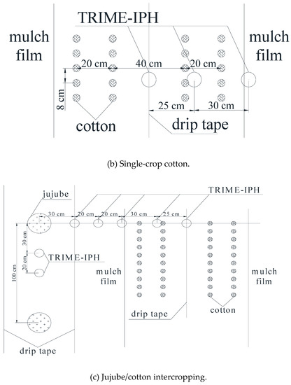 We assumed that the surface runoff was 0 mm, due to the use of drip irrigation. We assumed that the deep leakage was 0 mm, due to the fact that groundwater depth was over 10 m. Soil water storage was measured using the TRIME-IPH(TRIME-PICO-IPH, Channel tech, China) soil moisture measurement system. The determination time was before and after each irrigation and after each rainfall. If a crop had a change in growth stage, we measured soil moisture again. The exact location of instrument is shown in Figure 2.