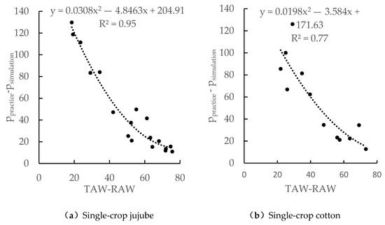 Table 3 shows the comparison results between the measured and simulated values of evapotranspiration of jujube trees and cotton in 2015 (verification), 2016 (fixed), and 2017 (verification). Compared with other months, the simulation error of jujube and cotton during the middle and late stages of growth (August to September) increased abnormally during the three years. This may be due to the increased water absorption capacity of the root system caused by severe water stress [34,35], which affects the simulation accuracy. The determination and modification of water stress are involved in the dual crop coefficient method, which mainly depends on the soil water consumption coefficient p. For this purpose, based on the 2016 soil moisture content measurement, the soil water consumption coefficient p was calculated. That is, the actual water consumption coefficient p was calculated by inverse analysis based on the measured soil moisture content, the ETc without water stress in the model, the water consumption in the root layer, and the total effective water content (TAW) in the root layer. We constructed a functional relationship between the root influence error (ppractice–psimulation) and the moisture content (TAW–RAW) in the root layer, which is prone to water stress. We included the soil water consumption coefficient p corresponding to the occurrence of water stress (Ks < 1) during the whole growth period of jujube trees. For cotton, because the total effective water content (TAW) is affected by the depth of the cotton root layer, the value fluctuates greatly, which is not conducive to model revision. Therefore, in this paper, the relevant data after water control were selected to modify the simulation results from August to September. Its correction function is shown in Figure 3. The corrected simulation results are shown in Table 3. The simulation error statistics are shown in Table 4.