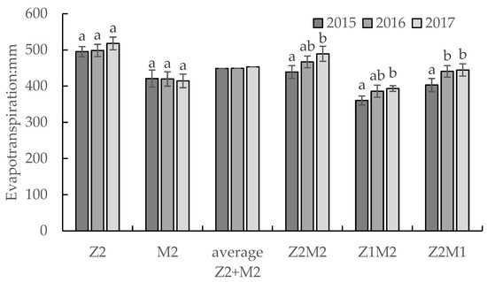 The measured values of crop evapotranspiration in the 3a single-cropping mode are shown in Figure 4, where the average Z2 + M2 is the weighted average of single-crop jujube and cotton according to planting area. Values followed by different small letters within figure are significantly different at 0.05 level. It can be seen from Figure 4 that the evapotranspiration of a single-crop jujube tree increased exponentially, from 495.27 to 498.52 mm and then to 517.83 mm. Single-crop cotton basically had no changes during the three years, and the overall evapotranspiration was steady at 414.34~420.89 mm. Comparing Z2M2 and average Z2 + M2 in 2015, the two values are similar, with a difference of only 2.19%. Over the course of the study, the difference gradually expanded, and by 2017 the difference reached 7.96%. This shows that the evapotranspiration in the intercropping mode increased significantly compared to the single cropping mode. There are two possible reasons for this situation: (1) due to the planting model, the root development of the two crops improved, and the ability to extract water from soil and shallow groundwater levels improved [36,37]; (2) intercropping enhanced sunlight retention, aerodynamic canopy roughness, and micro advection energy. Intercropping promotes crop physiological development significantly better than single cropping and increases evapotranspiration [38].