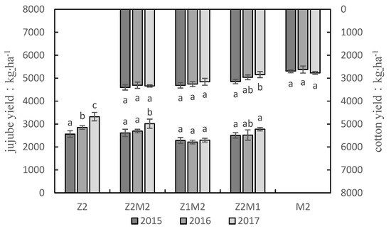 Figure 5 shows the yield of jujube and cotton crops under single-cropping mode. Values followed by different small letters within figure are significantly different at 0.05 level. The crop yield of the single-crop jujube tree steadily increased with time, reaching 3321.84 kg·ha−1 in 2017, while cotton is an annual crop, and the output remained at 2624.67~2774.19 kg·ha−1. When intercropping was carried out, the interspecies complementary effect was obvious in 2015, and the crop yield, especially cotton yield, increased by 26.47%. However, as the age of jujube trees increased, the intensity of interspecies competition increased, and jujube and cotton yields declined. As of 2017, jujube production fell by 9.25% and the cotton yield increased by 20.33%.