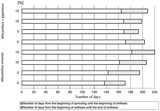 A transition from vegetative to generative stage, i.e., to flowering, is one of the crucial stages of development [47]. Regardless of the biowaste dose, Miscanthus sinensis plants developed their inflorescences on average by 12.6 days earlier than Miscanthus × giganteus ones (Figure 1). Nuñez and Yamada [48] ascribed this discrepancy to genetic variability of the species. Delayed flowering results in prolonged vegetative stage and increased biomass yield in C4 plants [49]. Plant response to increasing doses of shrimp biowaste depended on the cultivated species. Miscanthus sinensis plants began flowering on average after 136.8 days of cultivation. Addition of shrimp waste delayed their flowering in a dose dependent manner. At the highest biowaste concentration, flowering began on average by 45.5 days later than in control. Żurawik [36] also demonstrated a delay in the commencement of generative stage with increasing substrate salinity with shrimp biowaste. A contrary situation occurred in Miscanthus × giganteus. Supplementation with shrimp biowaste at 5%, 10% and 15% accelerated flowering by 2.9, 3.4 and 7.9 days, respectively. The impact of shrimp biowaste on the course of flowering was species dependent (Figure.1). Żurawik [36] claimed the inflorescence formation time may also depend on a cultivar. Miscanthus sinensis responded to the presence of shrimp biowaste by prolonging the stage of inflorescence formation. In the variants treated with 5% and 10% of the biowaste this stage was longer by 17.8 and 10 days, respectively. At the highest biowaste dose the plants did not complete this developmental stage during the experiment. In Miscanthus × giganteus plants exposed to shrimp biowaste at 5% and 10% inflorescence formation lasted by 7.3 and 1.5 days longer, and at 15% by 12.3 days longer. According to Veatch-Blohm et al. [50], increasing substrate salinity reduced flower duration of Narcissus ‘Dutch Master’ and ‘Ice Follies’ by 40% to 70%.