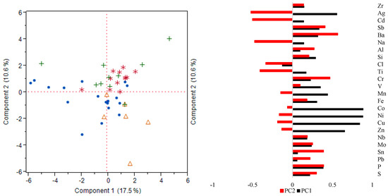 Principal component analysis of the elemental analysis of oils derived from different sources and olive oils of different geographical origin. Red stars (*) represent the olive oils derived from indigenous cultivars; green crosses (+) represent locally derived foreign olive oils; blue dots (•) represent foreign olive oils; and orange triangles (Δ) represent oils derived from other seed oils. (Right) Eigenvector loading scores for each element for the first two principal components.