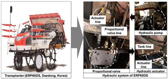 Transplanters are mainly used to plant grown seedlings on a seedbed for various agricultural crops such as rice, corn, cabbage, soybean, broccoli, and sesame. The world market of rice transplanter is dramatically increasing day by day due to the shortage of daily labor and the aging of the farmers. Goldstein Research [1] reported that the global rice transplanter market is estimated to reach USD 13.06 billion in 2024 from USD 8.07 billion in 2016. Kim [2] stated that the exports of Korean rice transplanter are decreasing compared with the previous year. On the other hand, approximately 6.7% of the farmers in Korea were over 65 years old in 2010, and this is expected to increase to 11.3% in 2050 [3]. Therefore, rice transplanters are an inevitable technology for rice farming. However, transplanters are completely mechanized in Korea, which accounts for 99.9% [4]. The main drawback of the existing transplanters is that they use an on–off valve that is unable to perform precisely. The planting depth control system is one of the crucial working parts of the rice transplanter, which is related to the planting accuracy and yield of rice. Sanusan [5] reported that the planting depth of the seedlings significantly affected the rice yield. Bozorgi [6] also reported that the optimum spacing of the seedling increased rice production. Therefore, precise technology is required for the accurate planting of the seedlings. In addition, the paddy field is not uniformly level, needs a float sensor in the rice transplanter that maintains the planting depth, but the existing rice transplanter using the on–off valve cannot consider the fluctuation of the soil level to plant the seedlings. As a result, the planted seedlings become tilted because of being pressed and pushed in the soil by the float sensor. Therefore, highly precise and modern technologies are required to control the plant depth, which ultimately enhances the performance of the transplanter and meets the farmers’ demand.