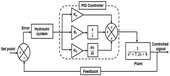 To develop the PID control algorithm considering viscosity, the mathematical model for a single-acting actuator and proportional valve was designed considering the third-order transfer function. The hydraulic actuator and proportional valve model are shown in Equation (1). The details derivations were discussed [42].