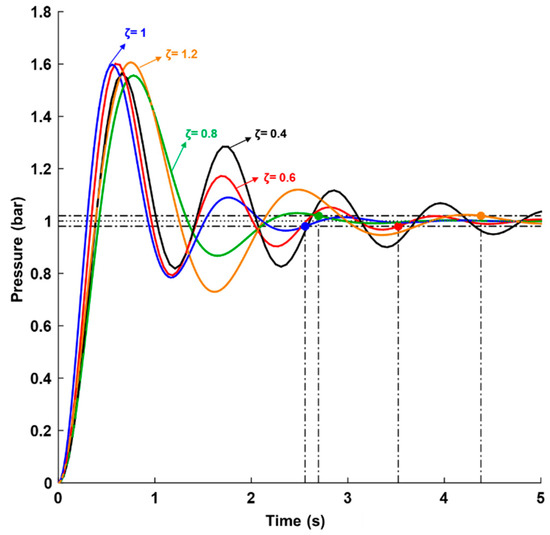 The coefficients of the control algorithm with its response characteristics are listed in Table 2. From these results, the coefficients of the control algorithm satisfied the boundary conditions. The boundary conditions are the maximum overshoot (≤25%), settling time (≤0.90 s), and steady-state error (≤1%) [36,48,49]. It is important to analyze the response characters of the control algorithm for various hydraulic oils in order to select the best PID control algorithm for controlling the pressure of the model.