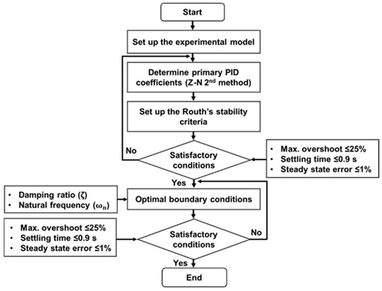 Figure 6 shows the boundary conditions and control strategies of the PID algorithm. First, the experimental model was set up to determine the primary PID coefficients using the Z-N second method. Second, the Routh’s stability criteria were applied to minimize the overshoot and sustained oscillations. Third, the boundary conditions were applied. If the response satisfied the conditions, it will be further verified after applying optimal boundary conditions. If the response is not satisfied with the conditions, the primary coefficients should be determined again.