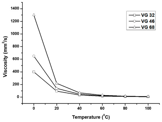 In this study, three ISO standard hydraulic oils available in the Korean local market for agricultural machinery namely Kixx RD HD (VG 32, 46, 68) were selected to determine the PID coefficient. As the highest temperature of agricultural machinery hydraulic oil is 100 °C for all-weather conditions [50], the temperature range was divided into five levels of equal intervals (0, 20, 40, 60, 80, and 100 °C). The viscosity of the selected hydraulic oils is shown in Figure 7.