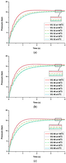 The performance of the PID control algorithm without considering viscosity was conducted for various hydraulic oils at six levels of temperatures, which is shown in Figure 9a–c. It was noticed that the pressures of the proportional valve for all types of hydraulic oils and all levels of temperatures (0, 20, 40, 60, 80, and 100 °C) smoothly increased and it took comparatively longer to become stable and stay at a constant pressure. It was observed that the maximum pressure of the proportional valve was around 15.405 bar at 100 °C for VG 32 for the lowest viscosity of the hydraulic oil. The pressure of the proportional valve was gradually decreased as the viscosity of the hydraulic oils increased. It was noticed that the overshoot and steady-state error appeared at the higher viscosity means at a lower temperature of the hydraulic oils. It also required a higher settling time.