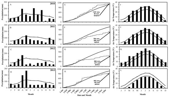Monthly rainfall distribution (bars) and monthly 30 year mean (line) for 2010, 2011, 2012, and 2013 (A–D); cumulative long-term and annual cumulative rainfall for 2010, 2011, 2012, and 2013 (E–H); and monthly maximum temperature (bars), monthly 30 year maximum (black line) and monthly 30 year mean (broken line) for 2010, 2011, 2012, and 2013 (I–L) at Bradford Research Center, University of Missouri.