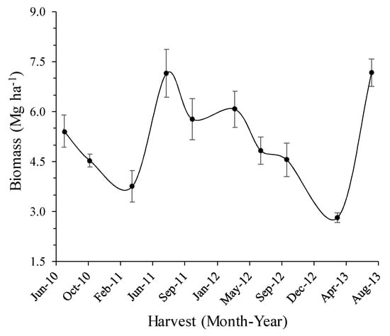 Annual mean yields during the study varied between 4.97 Mg ha−1 in 2010 to 5.56 Mg ha−1 in 2011. However, the lowest yield of 2.82 Mg ha−1 in March and the highest yield of 7.18 Mg ha−1 in July were observed in the same year, 2013 (Figure 2). Forage yields might have reflected the effects of growth responses during the early phase and the effects of weather. Our biomass yields were lower when compared with 10 Mg ha−1 harvested after three years [44]. These lower yields can be attributed to early phase of the experiment, dry weather conditions, and soil water deficit (Figure 1). In a metadata analysis Wullschleger [16] reported switchgrass yield ranging from 1 to 40 Mg ha−1, with the majority of data points within the 10–14 Mg ha−1 range. Our yields were within the ranges observed in other areas in the country.
