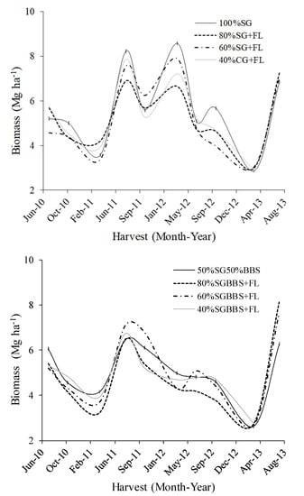 Our two main mixtures showed slightly different patterns of yield during the study (Figure 3). The SG mixtures had three prominent yield peaks, while the SGBBS mixtures had only two peaks. The first two mean peak yields were also larger for SG mixtures compared to SGBBS mixtures. This might indicate that SG responded better to favorable conditions compared to BBS. Similarly to our results, Jefferson [55] reported greater yield potential for SG across a latitudinal gradient compared to other species. However, the differences in yields among mixtures were not significant. Generally, all eight combinations followed the same pattern. The initial three harvests showed continuously declining yields. The fourth, sixth, and eighth yields were larger than the third, fourth, and seventh yields for most mixtures. The difference between mixtures were the smallest for 9th and 10th harvests. The 9th and 10th harvest occurred in 2013 after three years of growth. Species that were not suitable for the site and non-competitive species might have disappeared by this time and the yields would have come from the surviving few species. Each treatment may have been well established with surviving species during the fourth year. Figure 3 also shows variable yield differences among mixtures for the first three years of data collection, which supported this hypothesis, as those yields consisted of poorly performing species mixtures occupying the soil and space.