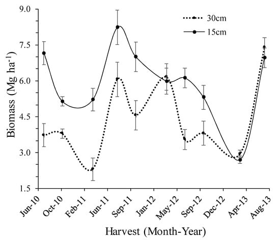 The two cutting height treatments did not respond in the same fashion. In some years, it reduced the subsequent biomass yield. For example, biomass yields declined from October 2010 to March 2011, July 2011 to October 2011, March 2012 to July 2012, and October 2012 to March 2013 for the 30 cm height treatment (Table 2, Figure 3). These declines ranged from −23% to −42%. The 15 cm treatments showed yield declines for July 2010 to October 2010 and July 2011 to March 2013, with declines ranging from −13% to −49%. The 15 cm treatment recorded reduced yield for five times as compared to four times for the 30 cm treatment. Although overall yields were greater for the 15 cm treatment, the number of times with reduced yields was lower for the 30 cm treatment.