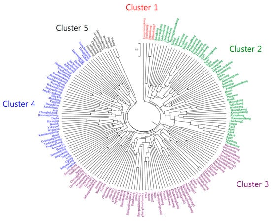 The number of alleles, major allele frequency, genetic diversity, and PIC values were analyzed using PowerMarker 3.25 software []. Genetic distances were obtained using PowerMarker, according to the method of Nei [], and the phylogenetic tree was prepared using the unweighted pair group mean arithmetic (UPGMA) method to compare group classification.