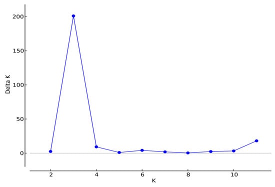 Values of ΔK, with its modal value detecting a true K of three groups (K = 3).