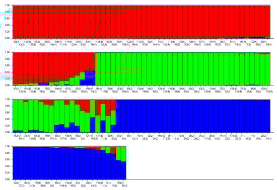 - Pritchard, J.K.; Stephens, M.; Donnelly, P. Inference of Population Structure Using Multilocus Genotype Data. Genetics 2000, 155, 945–959. [Google Scholar]