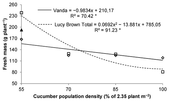 The commercial yields of the cultivars were similar to the commercial fresh masses. The commercial yield of ‘Lucy Brown’ was highest at the lowest cucumber population density, corresponding to 1.57 kg m−2. All ‘Vanda’ plants had commercial quality, so the commercial yield was equal to the total yield.
