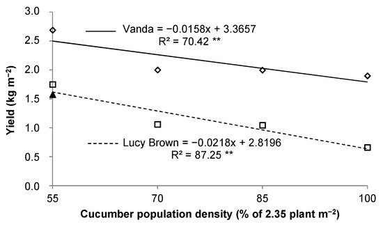 Cucumber yield by plant and by area as a function of population densities. ◊ kg plant−1; ▲ kg m−2. ** p ≤ 0.01 in F test.