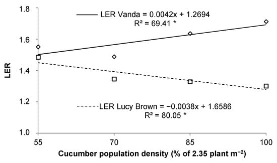Land equivalent ratio (LER) of the intercropping of ‘Vanda’ and ‘Lucy Brown’ with cucumber. ◊ LER ‘Vanda’; □ LER ‘Lucy Brown’. * p ≤ 0.05 in F test.