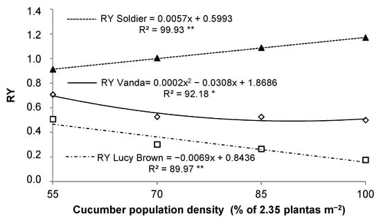 Relative yield (RY) of the intercropping components of ‘Vanda’ and ‘Lucy Brown’ with cucumber. ◊ RY ‘Vanda’; □ RY ‘Lucy Brown’; ▲ RY ‘Soldier’. * p ≤ 0.05; **:p ≤ 0.01 in F test.
