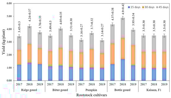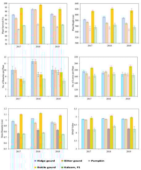 The effect of rootstock cultivates on vegetative growth parameters during three seasons is shown in Figure 1, which indicates the vegetative growth parameters in the real rooted and grafted treatment of hybrid cucumber cv. Kalaam F1 grafted on four local cucurbitaceous rootstocks (ridge gourd, bitter gourd, pumpkin, and bottle gourd). The statistical analysis of experimental data indicated that Cucurbita Moschata (Pumpkin) rootstock had lower plant survival rate during all study seasons as calculated (68.00% ± 0.58%, 74.00% ± 1.00%, and 71.00% ± 0.84%) in the 1st, 2nd, and 3rd seasons, respectively. The results clearly showed the unsuitability or partial incompatibility of local cucurbitaceous pumpkin rootstock with hybrid cucumber scion. The highest significant survival rates (92.18% ± 0.76%, 96.33% ± 0.88%, and 93.00% ± 1.53%) during all three seasons was noted for hybrid cucumber scion grafted on bottle gourd rootstock (Lagrenaria Siceraria). The survival rate is followed by grafted cucumber on ridge gourd (Luffa Operculata) and bitter gourd (Momordica Charantia) after bottle gourd rootstock in all three seasons, while Kalam F1 gave significant same values with bitter gourd rootstock. These results are comparable and agree with Al-Debei et al. who reported 100% survival rates when cucumber cultivars grafted onto local resistant rootstocks by tongue or upper grafting method (hole insertion) instead of non-grafted plants [].