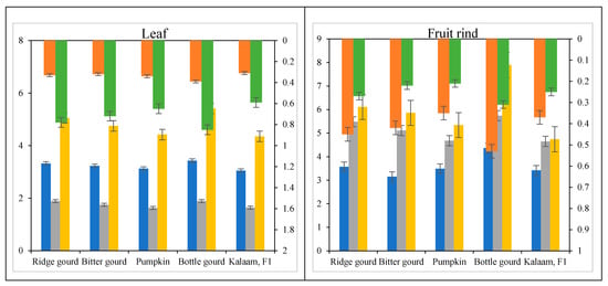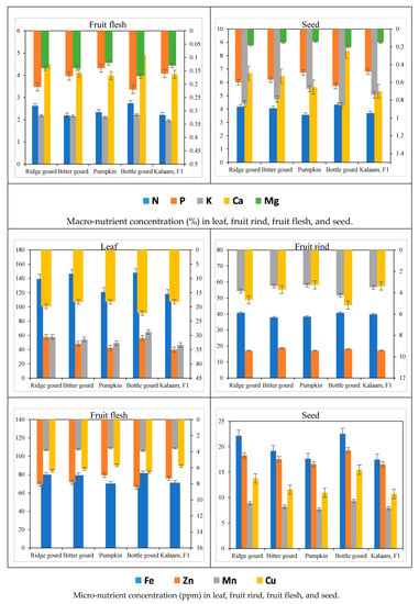 The analysis of macro (N, P, K, Ca, and Mg) and micro (Fe, Cu, Mn, and Zn) plant nutrient in leaf, fruit flesh, rend, and seed is presented in Figure 2. Leaves were sampled at the flowering stage while fruit flesh, rind, and seed were sampled from fully ripe fruits. Rootstocks effects on leaf mineral composition of grafted cucumber was significant. The heights N concentration of leaf was noted in bottle gourd, while the lowest N concentration was determined in actual rooted (Kalam F1) rootstock. Similar results were observed in P content. The heights K content was recorded in ridge gourd leaf; lowest K content was found in pumpkin and Kalam F1 rootstocks leaves. Bottle had the highest Ca content, while the lowest Ca content was in Kalam F1. Pumpkin had more Ca content as compared to Kalam F1. Similar results were found for Mg content in all leaves. The micronutrients (Fe, Mn, and Cu) were recorded highest in bottle gourd leaf, and the lowest was observed in real rooted hybrid cucumber rootstocks. The ridge gourd and bottle gourd showed similar Zn contents.
