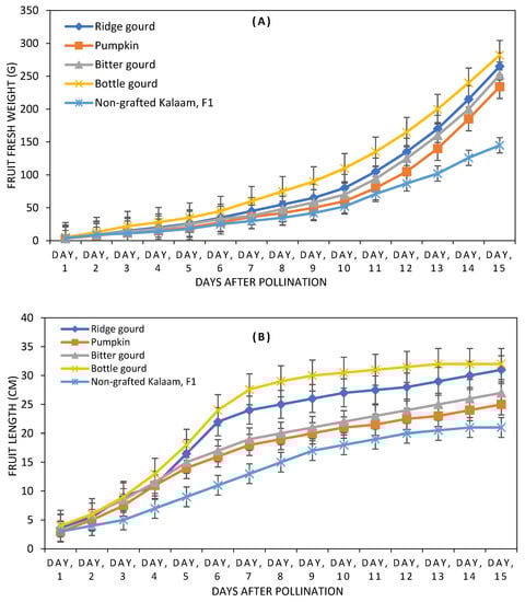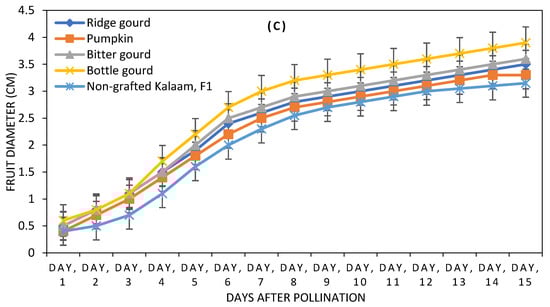 The effect of rootstocks on the fresh weight, length, and diameter of cucumber fruits is shown in Figure 4. Figure 4A indicated that, after 4 days of pollination, the mean fresh fruit weight increased significantly. The fresh weights of grafted plants were significantly higher than those of non-grafted plants. After 8 days of pollination, grafting increased fruit fresh weight as compared to non-grafted. The length of fruit improved significantly after 3 to 7 days of pollination (Figure 4B). The grafted plants showed significant longer fruit length compared to non-grafted plants after 8 days of pollination. However, fruit diameters increased slowly from first to 4 days after pollination and increased significantly from four to 7 days after pollination. Fruit diameters of grafted plants were significantly higher than non-grafted plants. After 8 days of pollination, fruit diameters of grafted plants exceeded significantly than non-grafted plants as shown in Figure 4C. The analysis concluded that grafted plants showed significantly higher weight, length, and diameter of fresh fruit non-grafting plants.