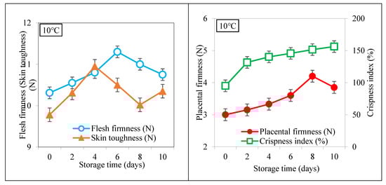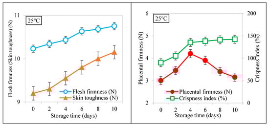 For the 25 °C storage test, the weight loss during storage at 25 °C was more than 1% (Figure 6). Similar to the 10 °C storage treatment, distinct influences of storage at 25 °C under humid conditions on the physical properties were clearly observed. Crispness index and flesh firmness values increased with storage period at 25 °C, although the values of after 6 days were not so different. Skin toughness also increased with storage period. The tendency of increasing placental firmness was found on 4 days of storage.