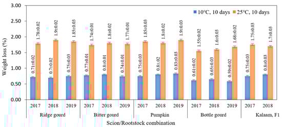 Two-storage test, one at 10 °C and the other at 25 °C, was performed to evaluate the influence of storage on physical properties of fruits as shown in Figure 5. For the 10 °C storage test, it was observed that the weight loss is less than 1%, as shown in Figure 6. Chilling injury commonly caused by cold storage was not observed. Distinct effects of storage at 10 °C under humid conditions on the physical properties of flesh firmness and the crispness index were observed in all grafted and non-grafted cucumber fruits. The data of bottle gourd cucumber fruits stored at 10 °C are presented in Figure 5. Flesh firmness of bottle gourd grafted fruit increased with the storage period until 6 days. Crispness index values also increased with the period of storage, becoming approximately 50% higher at 10 days. There was also an increasing trend placental firmness and skin toughness with storage until 4 and 8 days accordingly. The data displayed that the fruit skin, flesh, and placenta became firmer/tougher when stored at 10 °C for 6 days. After 6 days of storage, a slight decline in placental firmness, flesh firmness, and crispness index were observed.