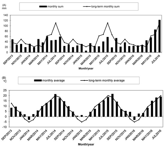 Precipitation (A) and air temperature (B) at the site of the field experiment.