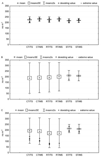 Variation in plant density in the first (A), second (B), and third (C) research year depending on winter wheat growing technology (CT—conventional, RT—reduced, ST—strip-till) and post-harvest treatments (TS—shallow tillage, MS—mulch).